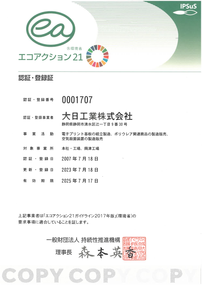 大日工業株式会社は、電子制御製品の製造過程における全ての工程で自然環境を保全とすることを念頭に置いた生産活動と継続的な改善活動を基本とし、地球環境の更なる向上に努めます。